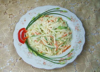 - Trộn tất cả su hào, cà rốt, dưa leo, táo, sốt mayonnaise với nhau rồi xúc ra đĩa, rắc vài hạt cốm bạc hà lên trên rồi trang trí cho đẹp.