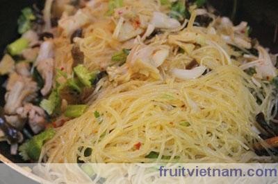•  Cho mộc nhĩ vào đảo cùng, đều tay. – Cuối cùng cho miến vào xào cùng, đảo nhẹ tay để sợi miến không bị nát, thêm gia vị cho vừa miệng, xào khoảng 5 phút.
