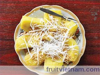 Mít hông chín có màu vàng rất bắt mắt, thơm lừng cả bếp. Gắp ra dĩa rồi rắc thêm ít đậu phụng giã nát hay mè rang rồi thưởng thức.