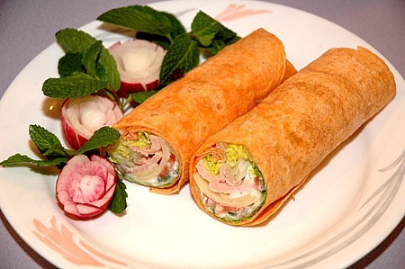 - Để 8 miếng “ham” chay lên trên phô-mai, cuối cùng là 2 miếng sà-lách lên trên. Cuốn tortilla lại. Tiếp tục làm phần 2 – 4, cho đến hết tortilla.