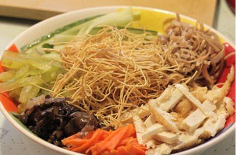 – Cuối cùng cho mỳ đã rán vàng vào giữa, rắc lên trên lạc rang chín, khi dùng món chay thì trộn đều lên thêm phần xì dầu đã pha.