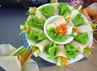 Đặt một miếng bánh cuốn gỏi cuốn trên tấm thớt hoặc đĩa. Phết một chút xốt mận vào giữa và chung quanh.