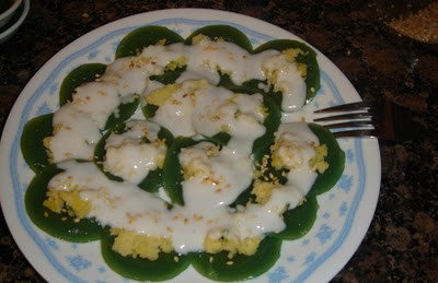 Nước cốt dừa nấu lên, cho tí muối và tí bột bắp vào, hơi sền sệt. Chan vào mè rang vàng, rắc vài hạt lên cho thêm hấp dẫn.