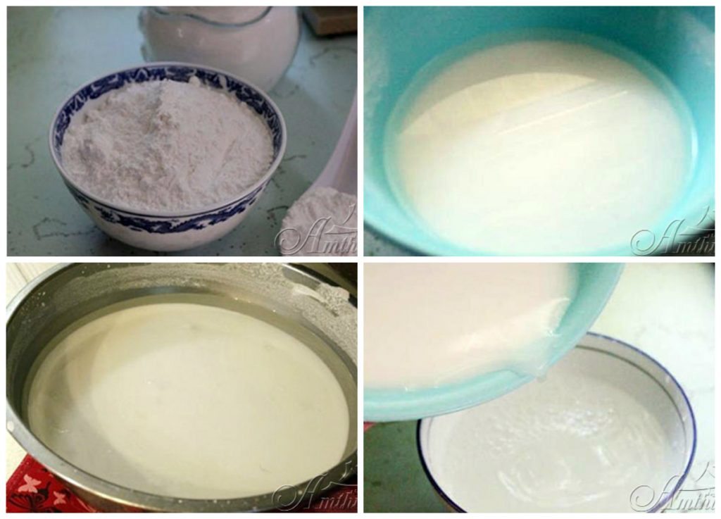– Hòa tan bột năng và bột gạo, thêm muối vào, trộn đều.