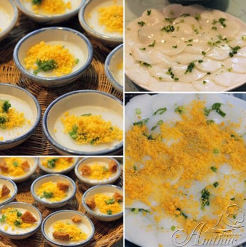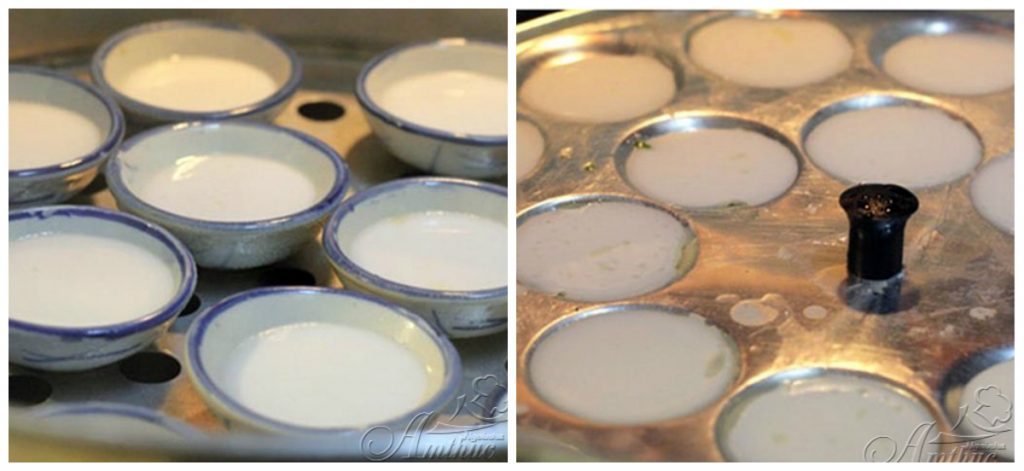 – Khuôn thoa dầu ăn, xếp khuôn vào xửng hấp, nước ở xửng sôi già bạn mới châm bột vào khuôn, đậy kín nắp, thỉnh thoảng dùng khăn sạch lau nước đọng trên thành nắp. Hấp từ 6 đến 8 phút, bánh nổi trong là chín.
