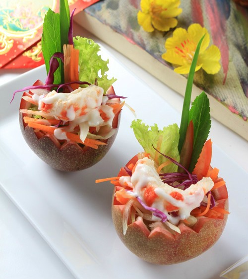 3 Cho các nguyên liệu rau củ vào trong trái chanh dây, xếp tôm lên trên. Rưới nước xốt sữa chua, hành tây băm vào. Có thể dùng món chay ăn kèm bánh mì bơ tỏi hoặc dùng như món khai vị thông thường tại các bữa tiệc.