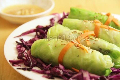 6. Rải lá bắp cải đã trần ra đĩa, xếp lần lượt cà rốt, su su, ngô, đậu chiên vàng, bắp cải tím thái sợi rồi cuộn lại.