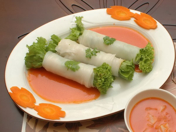 – Đặt ít xà lách, rau thơm, (nếu không có rau tiến vua cho cọng dưa leo), 1 muổng nhân, 1 ít majonaise rồi cuộn tròn.