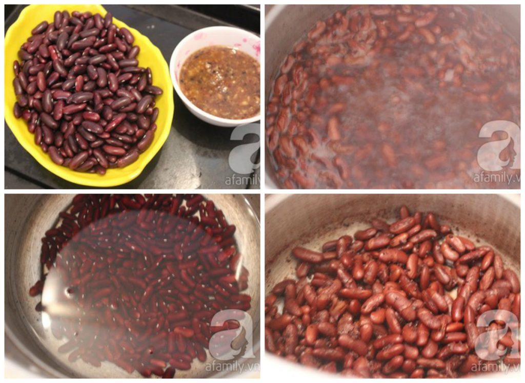 – Cho đậu đỏ vào nước ngâm khoảng 3 tiếng cho mềm. Sau đó cho đậu vào nồi áp suất đổ nước ngập đậu và ninh. Bạn có thể cho chút muối nở – baking soda sẽ làm đậu nhanh nhừ hơn.