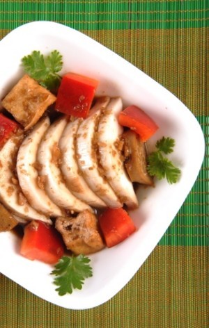 - Củ hũ dừa rửa sạch, xắt đôi, rồi xắt lát. Chả chay xắt đôi, xắt miếng. Đậu hũ chiên xắt làm đôi.