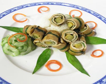 - Trải từng miếng đậu hũ ra dĩa, cho thỏi khoai lang chiên, ít lá rau răm vào cuộn tròn, dùng dây boa rô cột lại.