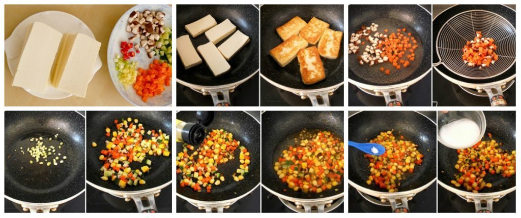 – Đun nóng dầu trong chảo, nhẹ nhàng thả từng miếng đậu vào rán vàng.