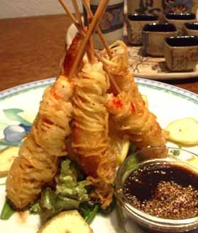 • Dùng cây saté ghim tôm xong cuốn spagetti ngoài con tôm, dùng hồ trét lên cho mì dính lại