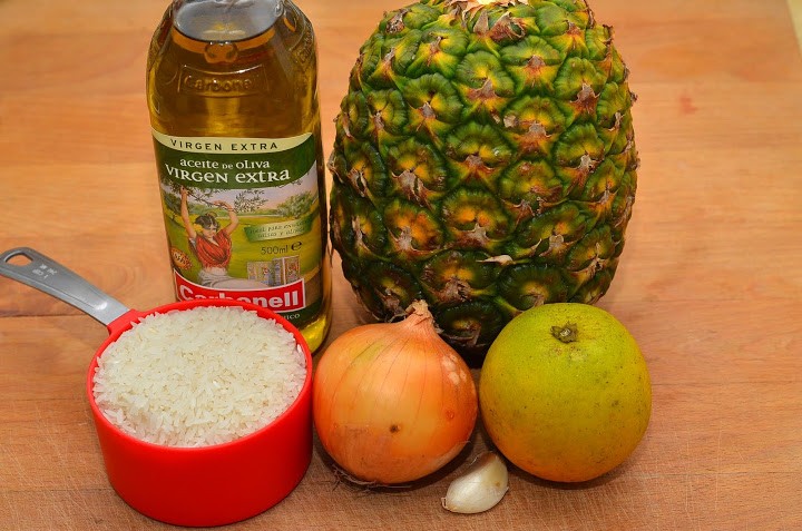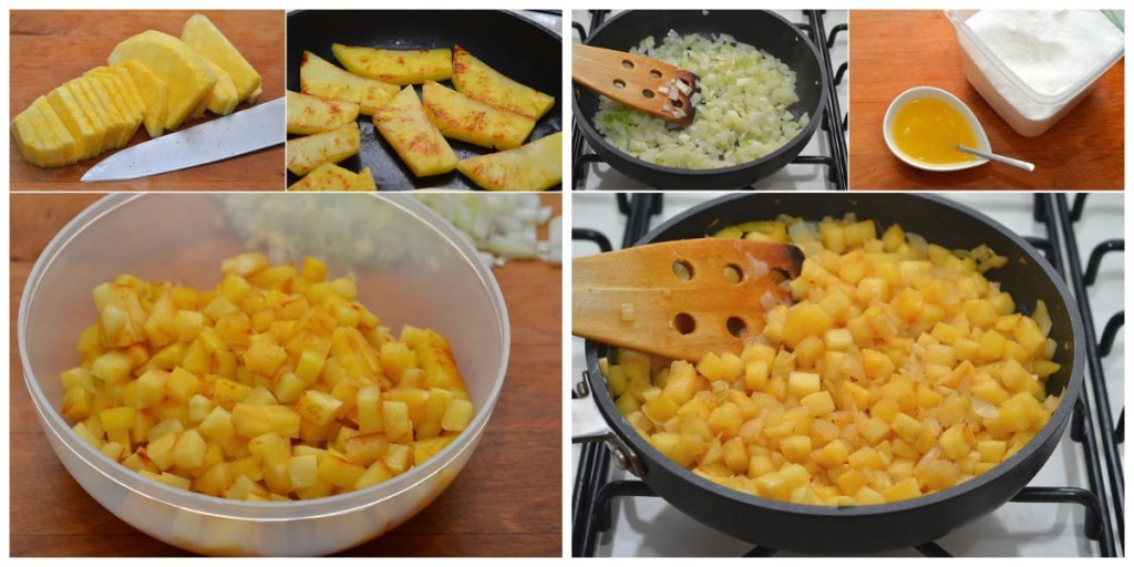 3. Phi tỏi thơm trong dầu nóng, sau đó cho hành tây thái hạt lựu vào xào chín. Đổ dứa vào chảo hành tây, rót thêm 60ml nước cam vắt đã hòa tan 1 thìa cà phê đường vào chảo, vừa đun vừa đảo cho dứa ngấm đều vị và hơi nước bốc lên cạn bớt đi trong chảo, chỉ còn lại nước xốt dẻo sánh.