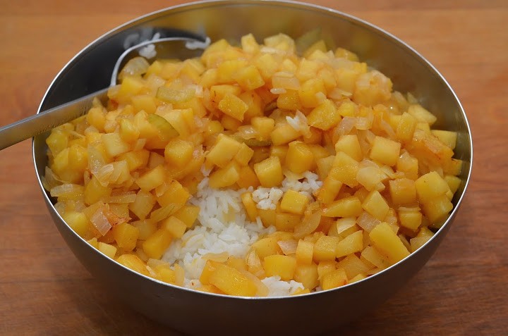4. Trộn đều cơm vào chảo dứa vừa đun, nhẹ tay không làm nát dứa.
