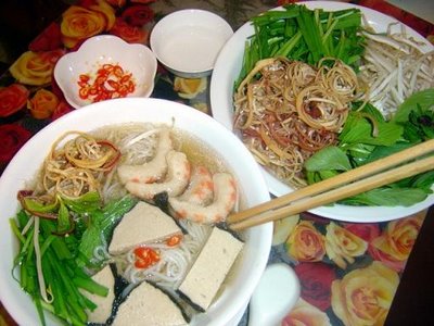 - Món bún này ăn với giá sống, đủ loại rau thơm, rau muống chẻ và nếu có thịt heo quay chay thì tuyệt vời.