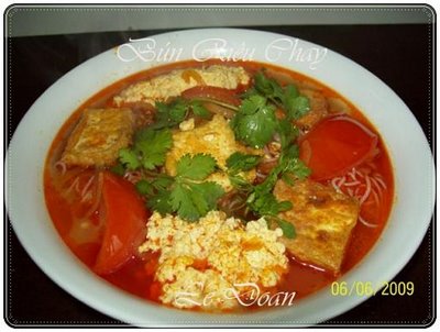 -Lấy một cái nồi ,cho dầu ăn và boa rô xắt nhuyễn vào khử cho thơm. Kế đến cho cà chua vào xào cho mềm,cho nước lạnh vào (lượng vừa đủ cho hai tô bún riêu) và để hai viên soup chay vào nấu đến khi thấy cà chua mềm thì cho tàu hủ chiên vào .