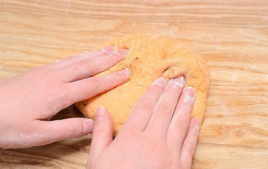 Khi nhào bột xong, rắc bột khô lên mặt bàn rồi đổ hỗn hợp ra mặt bàn có mặt phẳng tiến hành nhào bột. Nhào bột càng kĩ xúc xích bò chay ăn càng ngon.