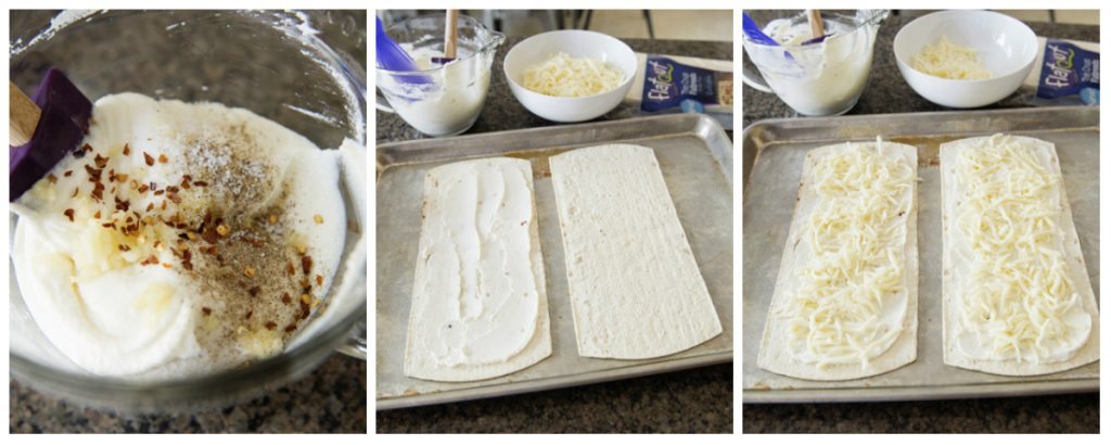 2. Chuẩn bị đế pizza ra khay rồi phết lớp hỗn hợp pho mai vừa trộn lên.