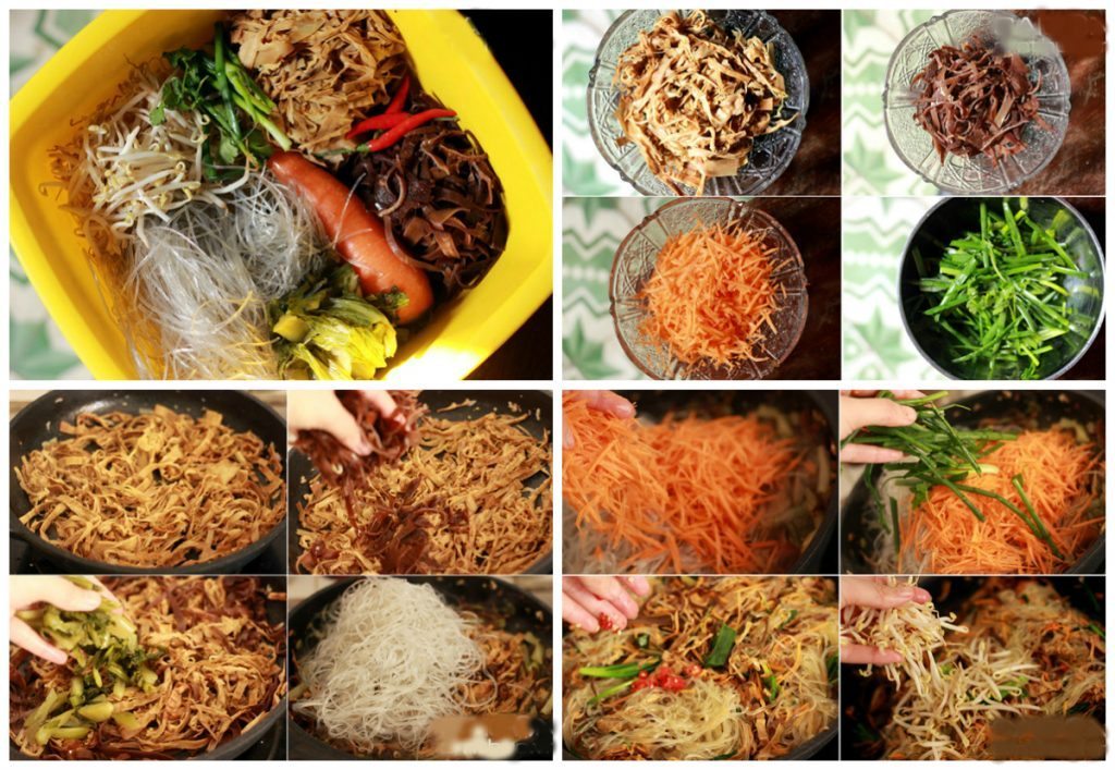 – Măng khô ngâm qua đêm, rửa kỹ, luộc và xé sợi. Nấm mèo ngâm nở, thái sợi. Cà rốt bào sợi. Hành lá rau mùi cắt khúc.