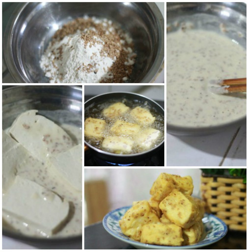 Đậu cắt miếng vuông vừa ăn, dày chừng 1.5cm. Thả các miếng đậu vào bát bột bạn vừa pha.