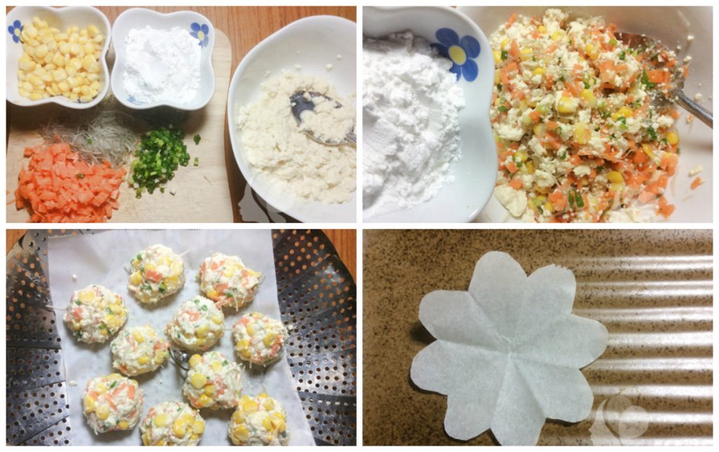 – Đậu phụ bạn dùng thìa nghiền mịn. Ngô ngọt nếu mua ngô tươi thì bạn chần qua nước sôi, nếu dùng ngô hộp thì vớt ra để ráo nước. Cà rốt gọt vỏ, cắt nhỏ. Miến dong ngâm nước cho hơi mềm rồi cắt nhỏ, chú ý không ngâm miến nát vì khi hấp miến hút thêm nước sẽ bị nát hơn. Hành lá thái nhỏ.