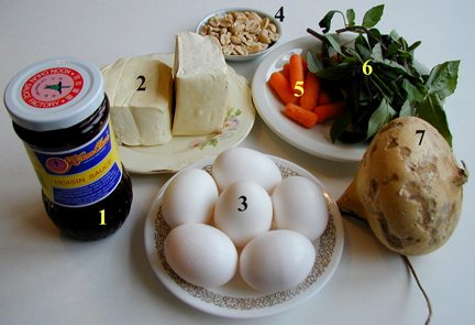 E. Khoảng 4 trứng gà đánh tan, dùng chảo không dính chiên mỏng. Cắt thành sợi nhỏ.