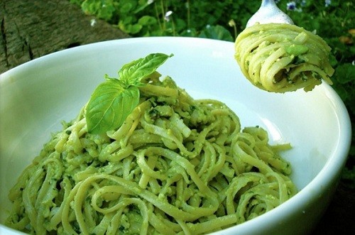 Món ăn thứ 4 trong thực đơn thuần chay ngày hôm nay chính là mì Ý quả bơ và lá quế. Khác với những món ăn đã kể trên, món mì Ý này chỉ cần nhìn thấy là biết thuộc họ đồ chay. Nhưng không phải vì thế mà nó trở nên kém bắt mắt đâu nhé! Màu xanh của bơ và lá quế khiến cho món mì vô cùng thu hút, khi thưởng thức lại có vị ngậy ngậy rất thơm ngon.
